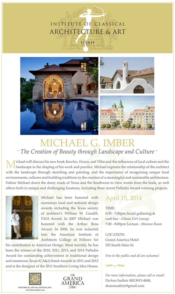 The Utah Chapter of the ICAA is pleased to have Michael G. Imber present “The Creation of Beauty through Landscape and Culture” at the Grand America Hotel on April 15th, 2014. Details can be found on the flyer below.