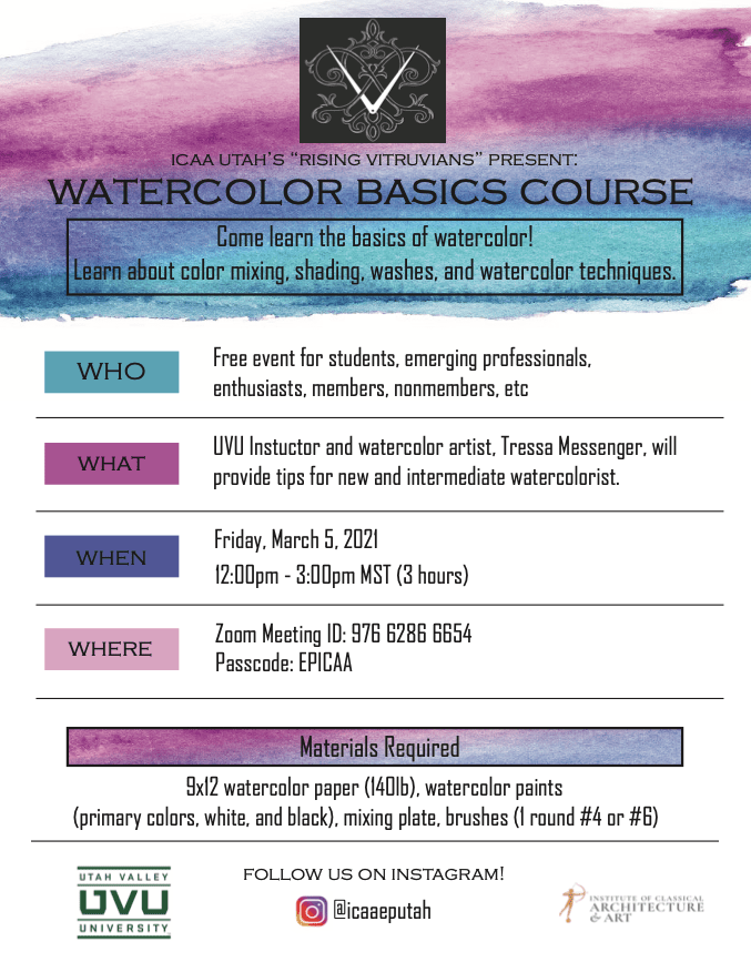 The Utah Chapter Emerging Professionals group, the Rising Vitruvians, are hosting an online water coloring course! This free course is open to members and non-members alike. Whether you are a student, emerging professional, established professional, or a hobbyist, and want to get started with water coloring, this is the perfect course for you!